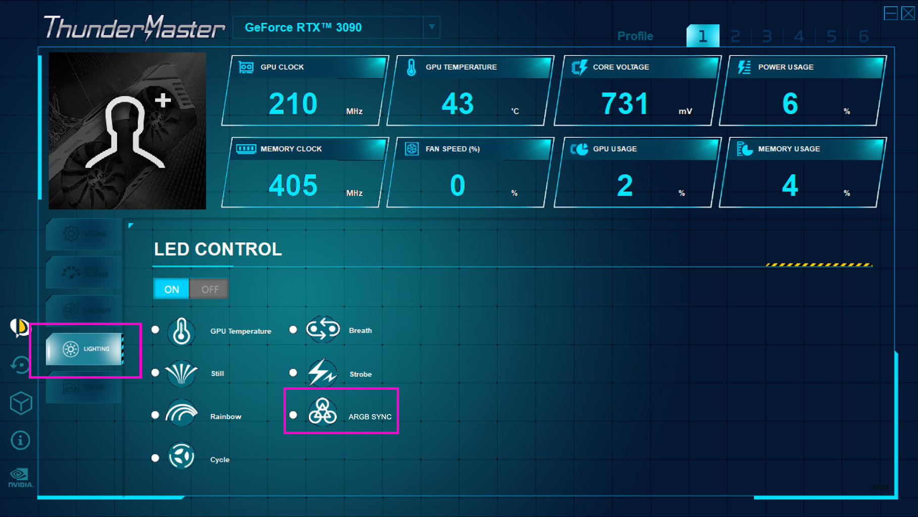 Please download the ThunderMaster and select “ARGB SYNC” under the “Lighting” tab. The software which controls the ARGB of PC devices will then be able to sync the lighting of PALIT graphics card.